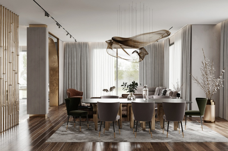 Sử dụng vật liệu tự nhiên: Gỗ tự nhiên, đá và kim loại là những vật liệu phổ biến trong thiết kế nội thất sang trọng. Sử dụng chúng cho các bộ bàn ăn, tủ kệ, và sàn nhà để tạo nên vẻ đẹp tự nhiên và độc đáo.