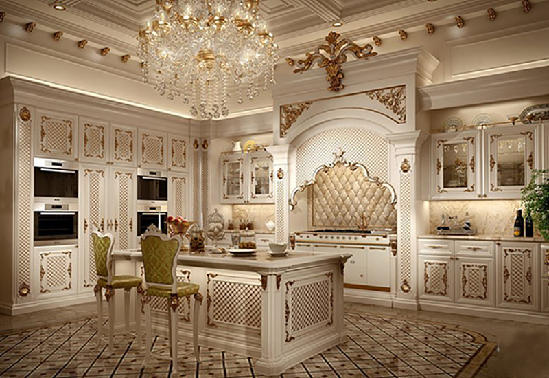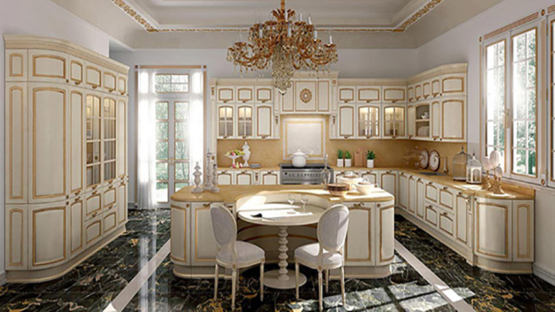 Phòng bếp cổ điển thường có một bộ bàn ăn lớn và các chiếc ghế ăn với họa tiết hoa văn tinh tế. Đèn chùm lộng lẫy trên bàn ăn tạo điểm nhấn cho không gian. Bàn trang trí và tủ chén cũng thường được sử dụng để trưng bày các bộ chén đĩa và đồ trang trí cổ điển.